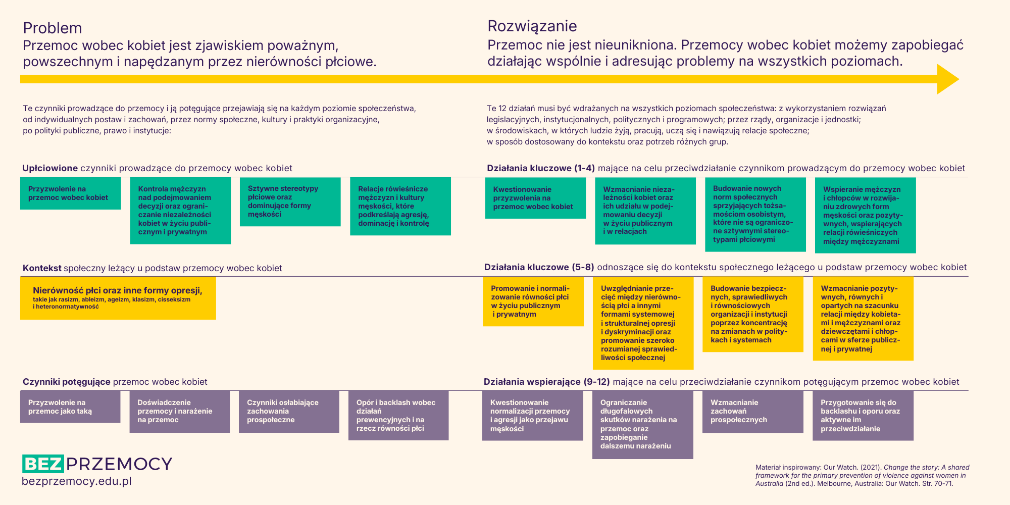 Poniższe osiem działań kluczowych oraz cztery działania wspierające łącznie odnoszą się do czynników prowadzących do przemocy wobec kobiet i ją potęgujących.